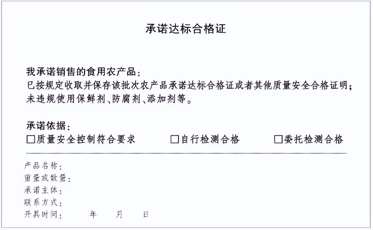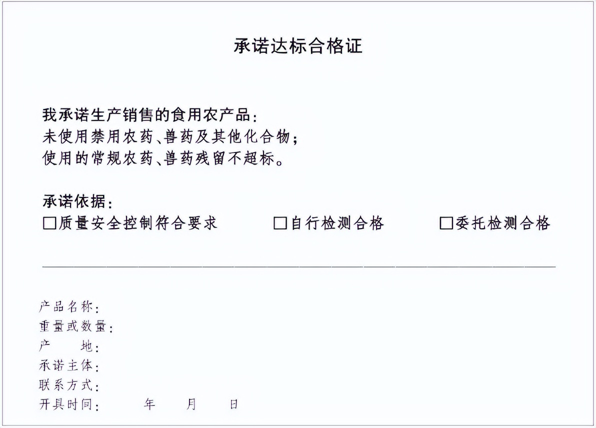 指农产品生产企业、农民专业合作社、农户和从事农产品收购的单位或者个人,根据质量安全控制、检测结果等依法开具,承诺其销售的农产品未使用禁用农药、兽药及其他化合物且使用的常规农药、兽药残留不超标等的证明。