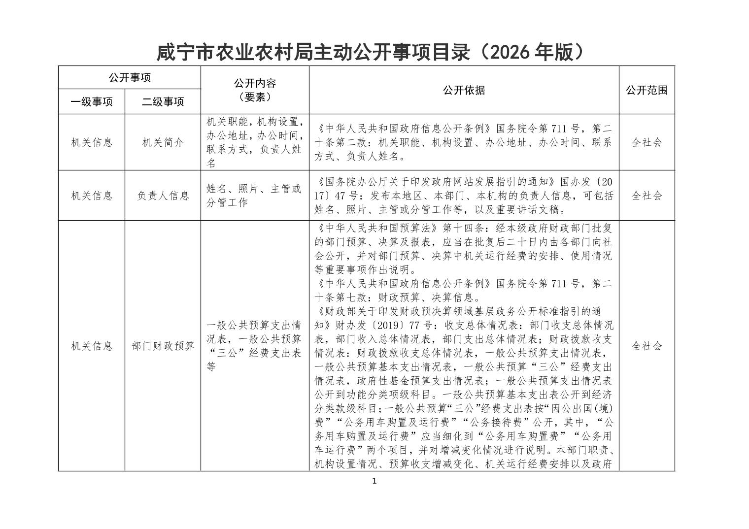 咸宁市农业农村局主动公开事项目录(2026年版)